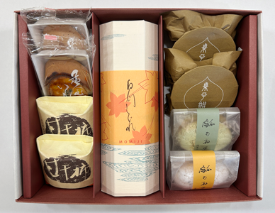【詰合せ内容】 白川しぐれ:1本 栗子餅:2コ 駄句和豆:各1コ 黄金いも:2コ 甘干柿:2コ